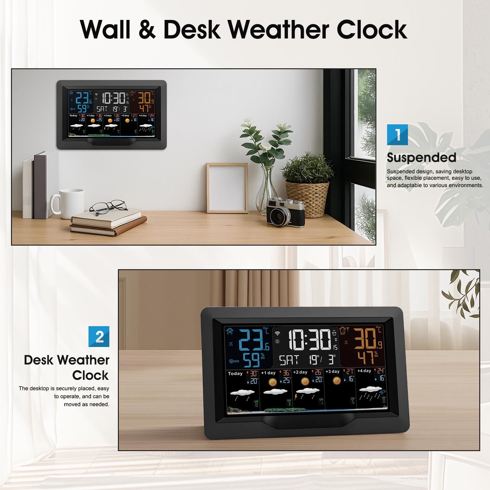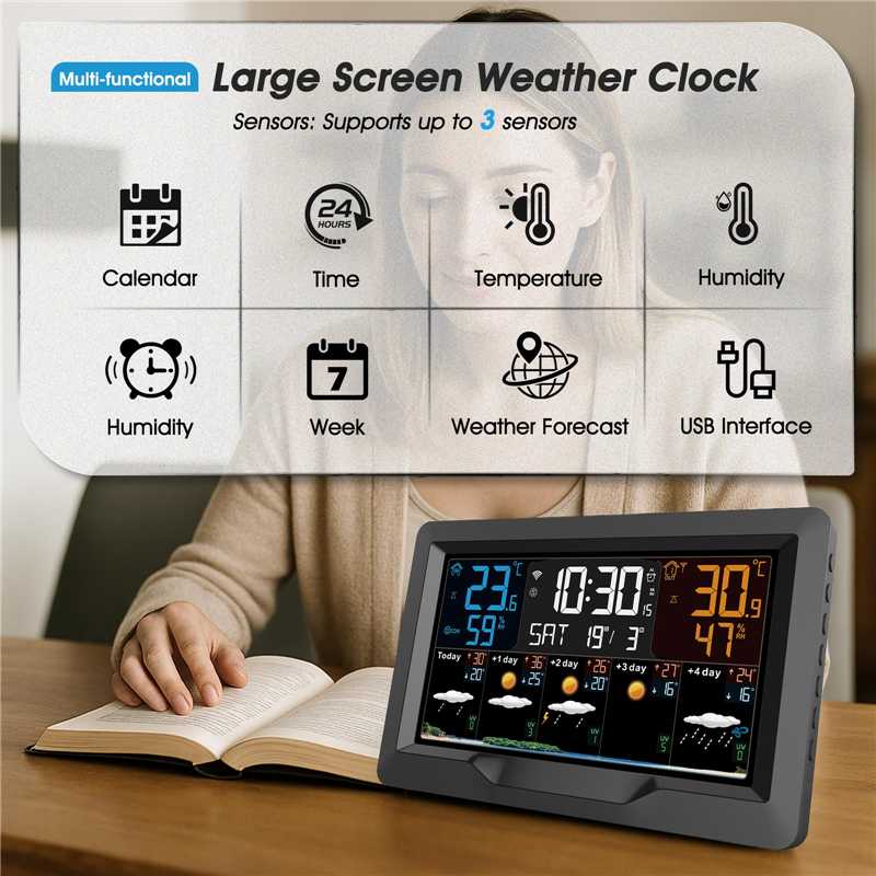 Packing list: 1 colour weather clock, 1 sensor, 1 power adapter, multilingual manual (15 languages)